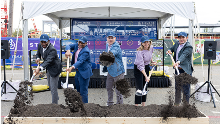 RICHMOND, VIRGINIA – April 10, 2025: The City of Richmond, the Richmond Economic Development Authority, Thalhimer Realty Partners (TRP), and Diamond District Partners, LLC (DDP) celebrated the infrastructure groundbreaking on April 10th of the major roadways connecting through the new Diamond District redevelopment. Officials from the City of Richmond, notably Mayor Danny Avula, Katherine Jordan (Richmond City Council), Matt Welch (Acting Director, Richmond Economic Development), and former Mayor Levar Stoney were in attendance along with Jason Guillot and Maritza Pechin with TRP/DDP. The groundbreaking follows the recent transfer of the 18-acre Phase 1A parcel from the Economic Development Authority to DDP as part of the Diamond District development project. Road “B” and Road “J” (see site plan) are the first two roads which will be constructed to connect Hermitage and Ashe to the new CarMax Park. This public infrastructure will provide utilities and access to CarMax Park as well as private development parcels. The Phase 1A public infrastructure also includes Road “A,” Road “C,” and the park. The Phase 1A public infrastructure work is funded with a $40 million public infrastructure bond. Whiting-Turner Construction, in partnership with Prestige Construction, is the general contractor, and the work is designed by Baskervill (master architect), Kimley-Horn (civil engineer), Water Street Studio (landscape architect), Lu+Smith (electrical engineer), and Groundswell (public space activation). Concurrently with the groundbreaking, DDP launched the brand for the Diamond District which was developed by Campfire & Co and is featured on site signage, a new project website (rvadiamond.com) and Instagram (@rvadiamonddistrict). The brand promise reads: “The Diamond District is Richmond’s sports and entertainment destination. Active by nature and connected by design, every visit invites you to find your home base.” The Phase 1A parcel includes six acres of public infrastructure (such as streets and parks), which DDP will convey back to the City and the EDA following completion. Approximately 12 acres will become private development that will include a 180-room hotel, 161 workforce housing units (at 60 percent of the area median income), 730 market-rate housing units, and 30,000 square feet of commercial space (with room to build more if there is demand). Phase 1B and Phase 1C will include an additional 177 affordable units, 625 market-rate units, and 126,000 square feet of commercial space. CarMax Park, the future home of the Richmond Flying Squirrels, is under construction and is scheduled to open in 2026. The Diamond District will be a new mixed-use neighborhood anchored by a new central park and CarMax Park. (Credit: Diamond District Partners, LLC)